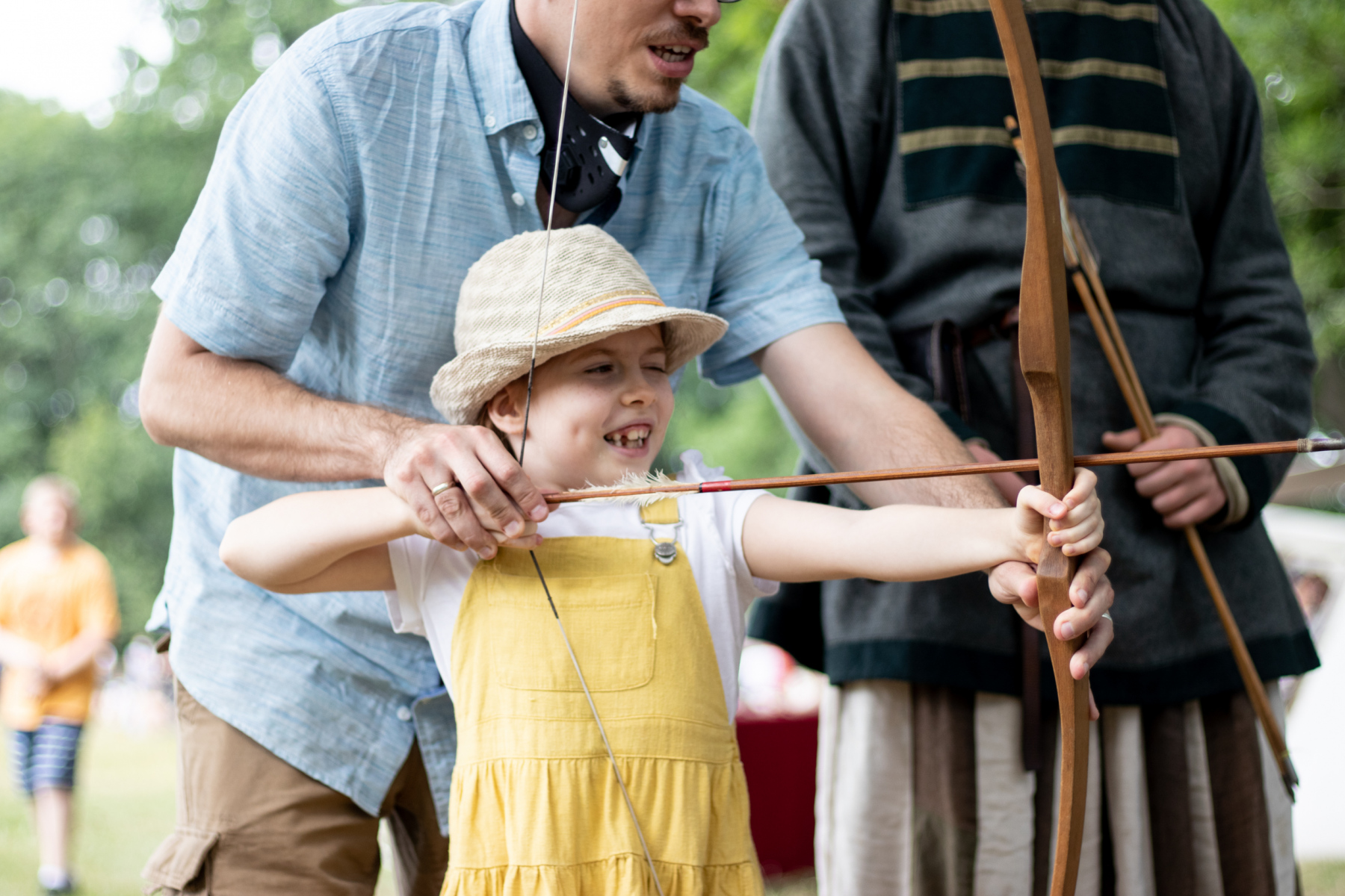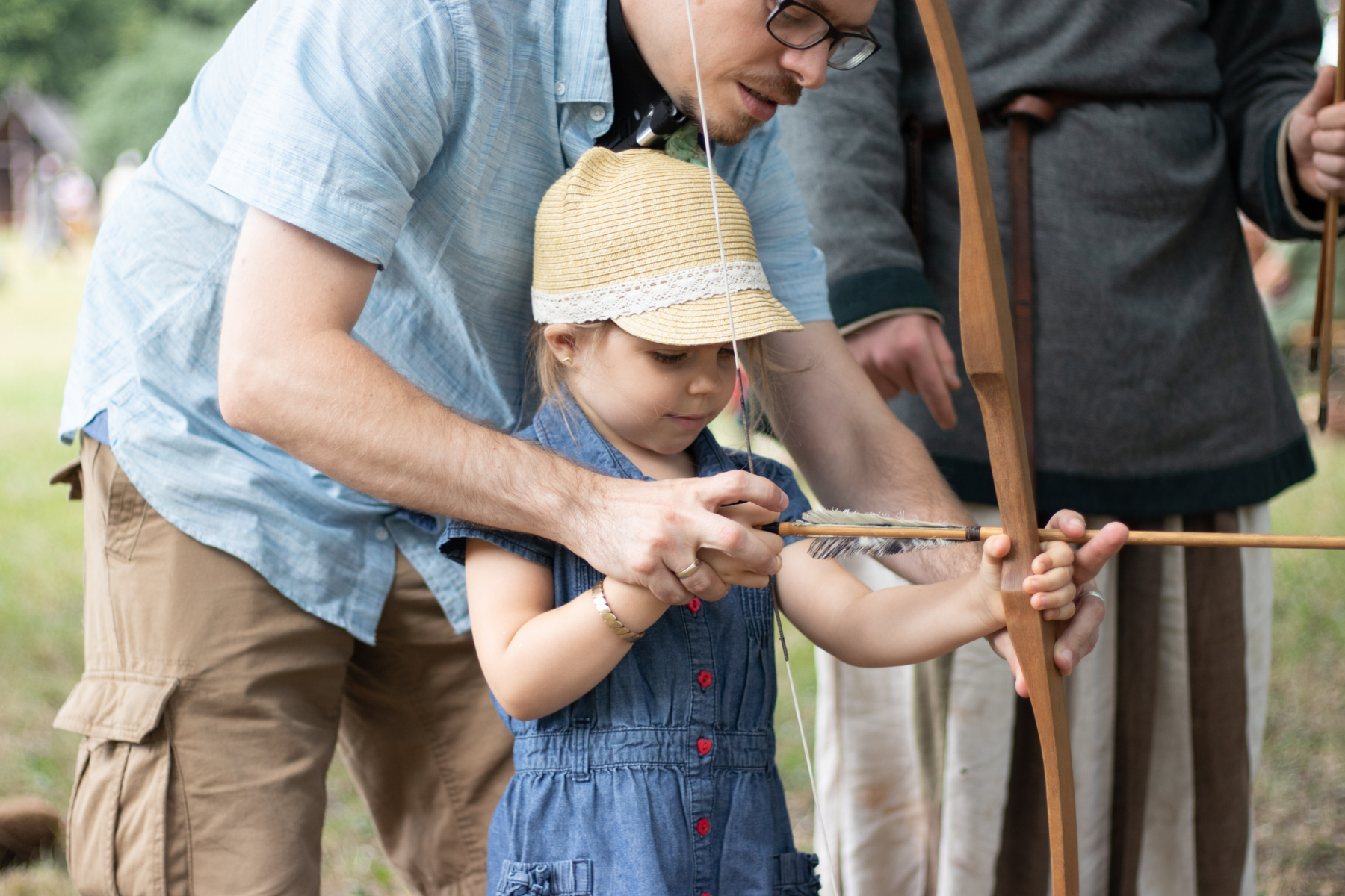 Zazwyczaj mam zawsze ustalony plan na nasze wyjazdy, sprawdzam okolicę, mam wydrukowane questy, ulotki. Co prawda Grzybowo było na liście, ale niekoniecznie w ten weekend, więc pojechaliśmy trochę nieprzygotowani. Jeżeli lubicie historię, strzelanie z łuku, czy oglądanie wojowników, to to jest miejsce dla Was. Z dziewczynkami byliśmy już w Grodzie w Pobiedziskach oraz na festynie w Lądzie, dlatego jesteśmy świadomi, że dziewczynki takie miejsca lubią. Tym razem próbowały strzelać z łuku, więc nie dało się wyjechać z Grzybowa bez własnego łuku. Ogólnie nie lubię przywozić z podróży tego typu pamiątek, ale na łuk dziewczynki czekały już długo, zatem wyjechały z Grzybowa z własnymi łukami i strzałami. Z tego co wiem, Rezerwat jest poza czasem pandemii dużo bardziej okazały, jeśli chodzi o atrakcje. Zatem pewnie jeszcze tam wrócimy, ale nawet podczas takiej małej imprezy plenerowej, na którą my trafiliśmy, mogliśmy dowiedzieć się paru cennych informacji, na temat życia w grodzie.